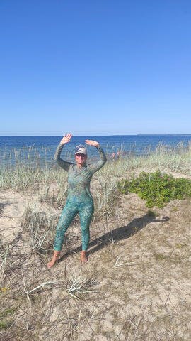 “Smarttani Rohelise Mandala komplekt oli kerge, mugav ja pilkupüüdev, nii promenaadil patseerides kui ka linnas kõndides. Esimesel kandmisel tundsin küll ebakindlust, kuna pelgasin kehavormide läbi kumamist, mis paarkümmend aastat tagasi probleemi poleks tekitanud. Tegelikult on värvide ja mustrite maagia nii oskuslikult kombineeritud, et jäävadki domineerivaks kõige muu üle. Kiidusõnu saab ka Emerald trikoo, mille materjal muutis kehasõbralikuks isegi jahedama koduse merevee.”