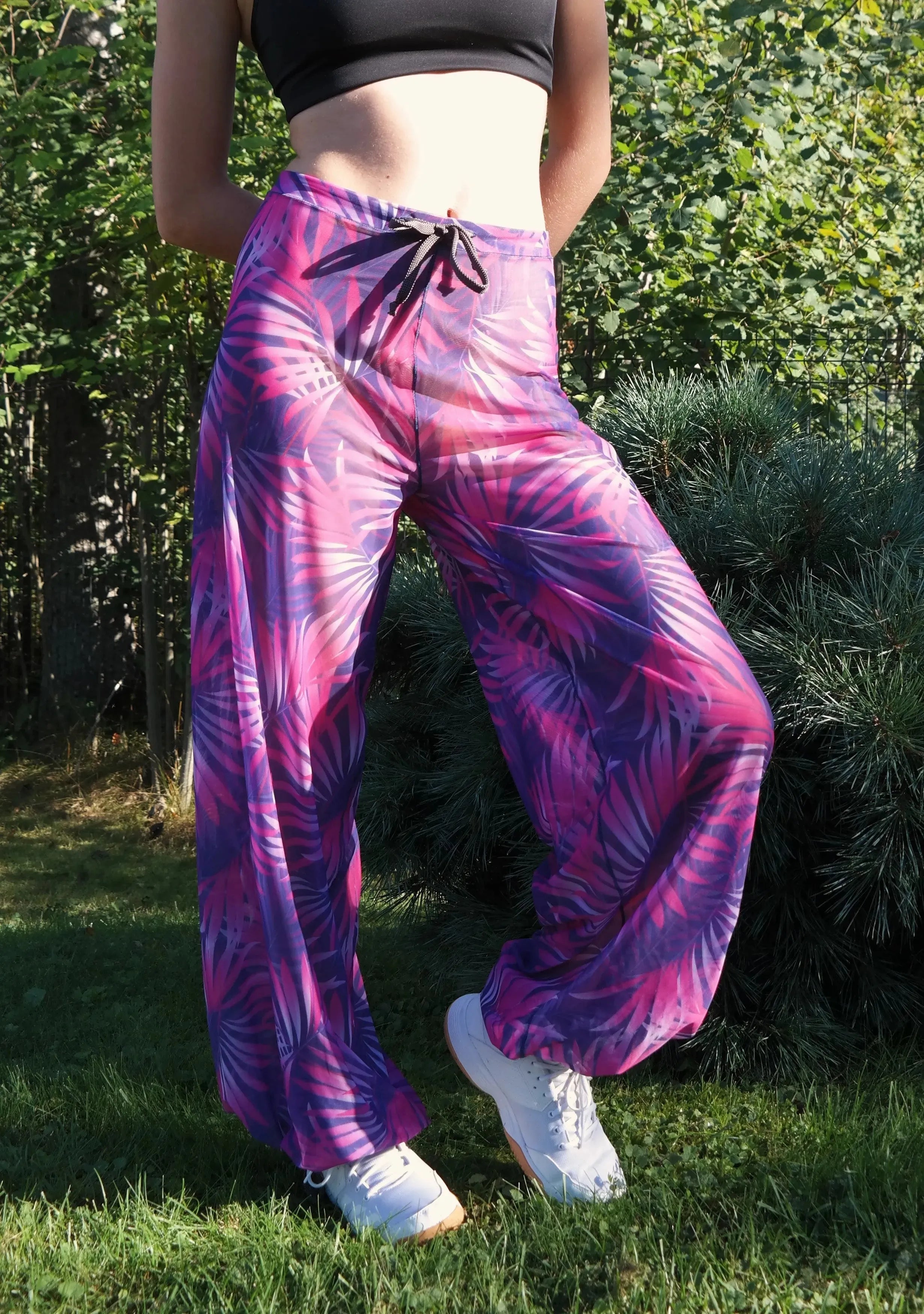 NB! Oleme muutmas Roosa Troopika kollektsiooni värvitoone erksamaks. Mida erksamad värvid, seda vähem paistab kangas läbi. Nendel Roosa Troopika pikkadel pükstel on värvitoonid erksamad, kui selle kollektsiooni varem valminud toodetel. Kui soovid just mahedamaid värve, vali püksid, mille tootenimetuses on märge "mahedamad värvid!"